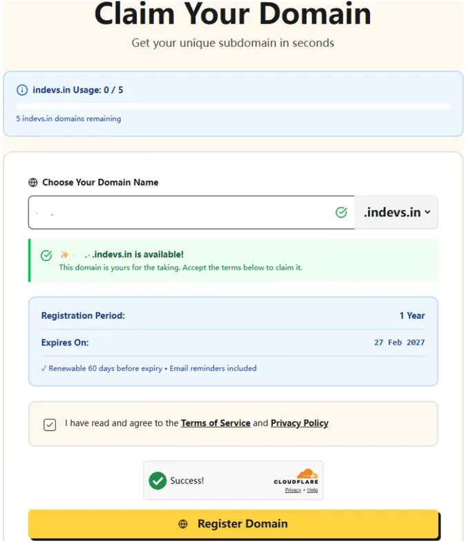 建议优先注册 indevs.in 后缀,勾选同意条款后点击「Register Domain」完成注册。