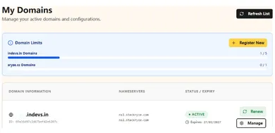 - 在域名控制台的「My Domains」中找到已注册的域名,点击右下角的「Manage」。