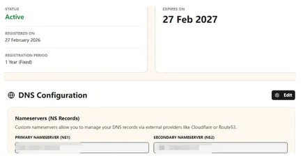 - 返回域名面板,在「DNS Configuration」中点击「Edit」,将 Cloudflare 提供的 2 个 NS 替换原有记录并保存。