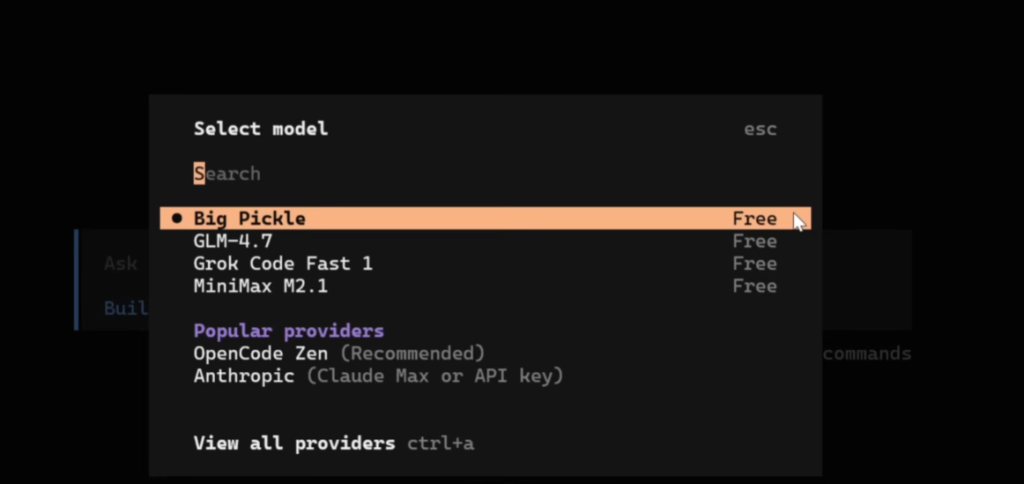 安装完成后,在终端输入 opencode 即可进入专属界面。此时它还没有“大脑”,我们需要给它配置模型。OpenCode免费为大家提供了好几个主流大模型,在对话框中输入核心命令: