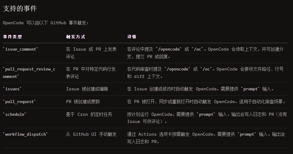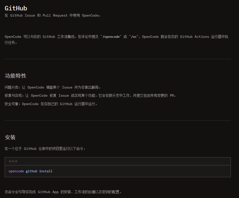 除了在本地终端折腾,OpenCode 还能直接挂载到你的 Github 仓库里! 你只需要在仓库的 Issue 或者 Pull Request 的评论区 @ 它(例如输入 /oc fix this 或者 /opencode 解释一下这个报错),它就会通过 Github Actions 在云端自动拉取代码、修复 Bug,甚至自己提交一个修复好的 PR 给你审查!